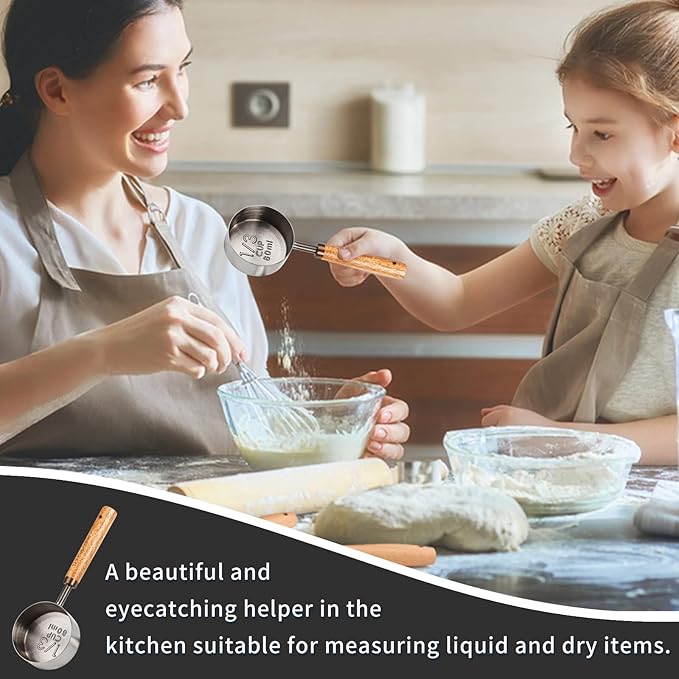 Measuring Cup with Wooden Handle, 1/2 Cup Titanium-plating 125 Ml Stainless Steel, Space Gray