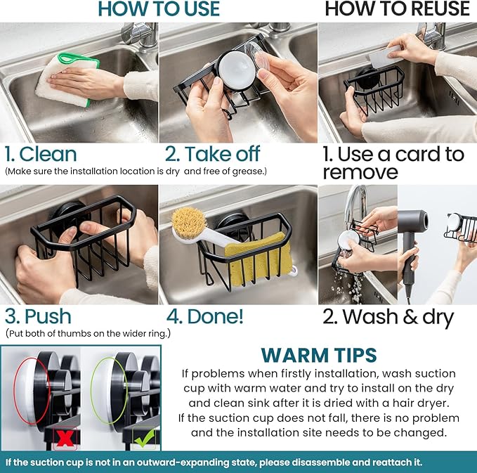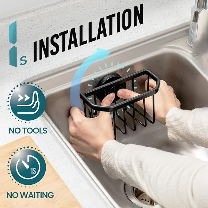 - [1 Second Installation & Removable]: Simply press down the suction cup to squeeze the air out, they will stick to the wall firmly. You can finish the installation in 1 second. No screws, no nails, no glue, no tools. The kitchen sink caddy can be re-positioned many times and removed without leaving residues (If problems when firstly installation, wash suction cup with warm water and try to install on the dry and clean sink after it is dried with a hair dryer)