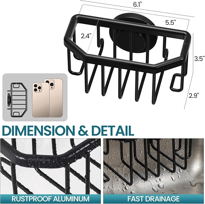 - [Rustproof & Fast Draining, Keep tidy]: Measures 6.1" x 2.9" x 3.5" and creat sink storage in compact spaces. Made of aluminum finished in rustproof coating which not only prevents rust but also stands up to times. With all-around drainage design, the sponge caddy has maximum air ventilation and fully dripes water away. Holds Sponge, Scrubber, Scouring Pad, Drain Stopper, And More! Keep your kitchen tools air dry quickly and clean