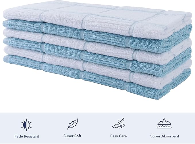 - FUNCTION MEETS STYLE: Our thick 100% Ring Spun Cotton kitchen towel will leave your dish dry with just a few swipes. This combination kitchen towel set has a total of six yarn dyed and solid kitchen towels which includes three aqua yarn dyed windowpane towels and three solid aqua windowpane dish towels each of size (15x26 inches). They come with a loop to hang for easy storage.