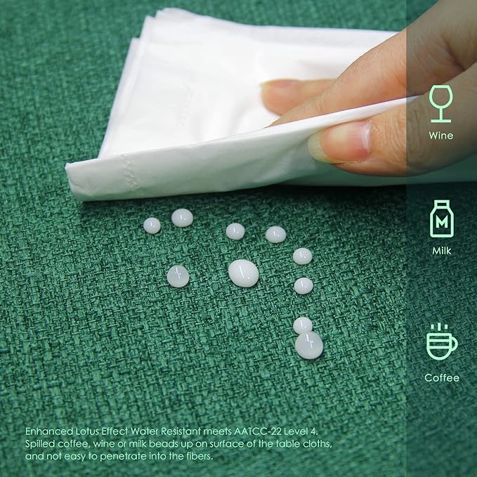 - 【Waterproof Table Cover】Enhanced Lotus Effect Water Resistant meets AATCC-22 Level 4. Spilled coffee, wine or milk beads up on surface of the table cloths, and not easy to penetrate into the fibers. You can absorb the droplets with napkin paper and you NO LONGER need to change and wash the table cloth every day
