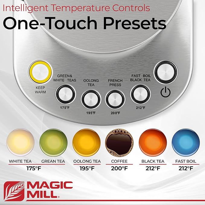 - BESPOKE BREWING AT YOUR FINGERTIPS: Discover the joy of a perfect cup of tea or coffee with Magic Mill's electric tea kettle with temperature control. Choose from pre-programmed settings for white, green, oolong, and black teas, and enjoy your favorite beverages brewed to perfection every single time.