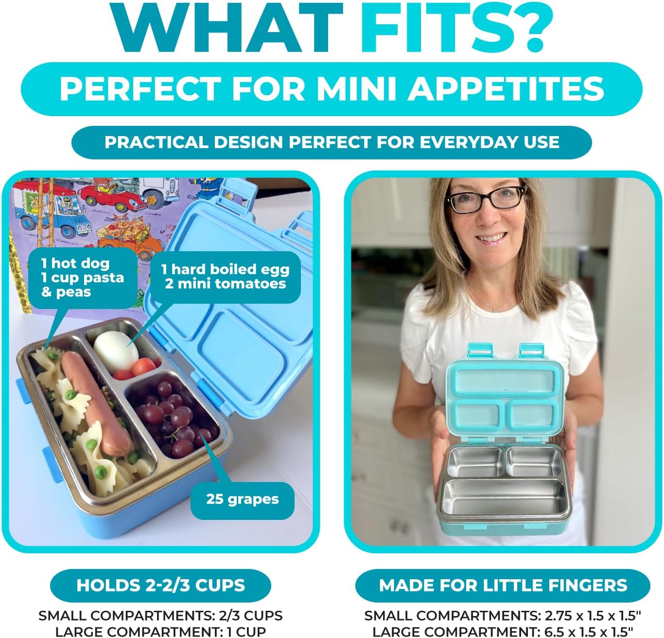 - PREMIUM MINI Steel Bento Box β A fun way to send your toddlers, baby and young children to daycare or preschool with a healthy lunch. This travel-friendly lunch box features 3 stainless steel section compartments sealed individually with high-grade silicone seals to keep food fresh. Includes spork. BPA and phthalate free. AGE 3+