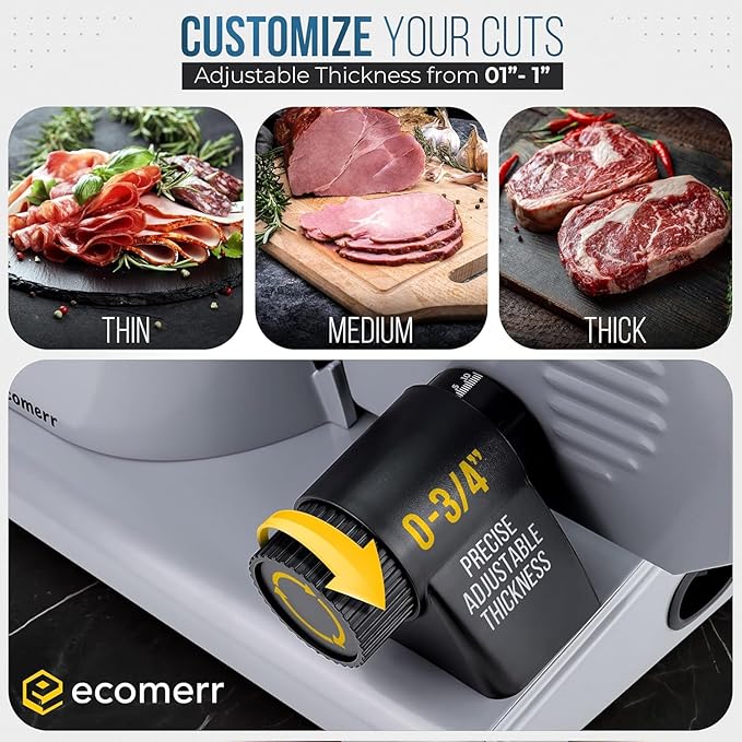 - CUSTOM CUTS - Whether you are planning to make thin jerky slices or thick pieces of ham, our delicatessen meat slicer has you covered. Its dial allows you to set the cutting thickness from 1" to 1".