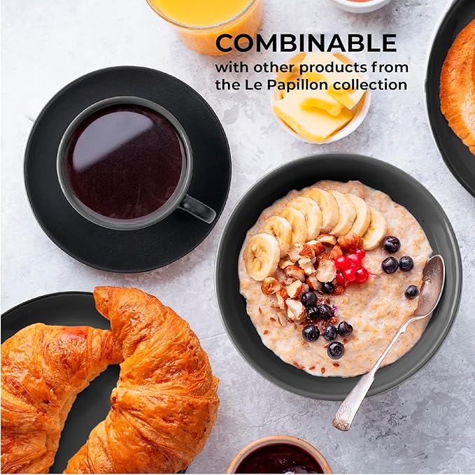 MIAMIO - Set of 6, Ceramic Stackable Cappuccino Cups Set / 6 Ounce Cappuccino Mugs and Saucer with Metal Stand for Coffee Drinks, Cafe, Latte, Americano and Tea - Le Papillon Collection (Black)