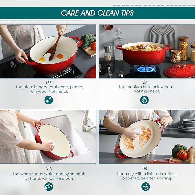 - 【One Pot For Multiple Use - Suitable For Larger Food】This 9.3-Quart vancasso enameled cast iron dutch oven is excellent for Larger food. It is resistant to acidic and alkaline substances, and you can use it to marinate food before cooking (prepare, cook, and serve food in the same pot). Safe for braising, simmering, baking, broiling, and roasting on gas, electric, ceramic, glass top, and induction stoves (not including microwave ovens); oven safe to 500°F.