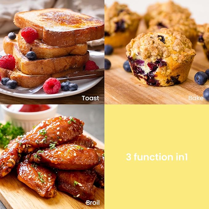 - 【3 IN ONE VERSATILE COOKING FUNCTIONS】Bake, Broil and a Toast all in a mini compact toaster oven to fit your daily cooking needs.