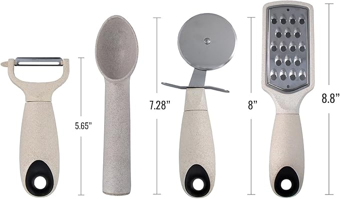 - 4PC KITCHEN UTENSILS: Do some of your old kitchen utensils need an upgrade? Why not make it a sustainable one? Beille’s four-pack of kitchen gadgets include an ice cream scoop, cheese grater, vegetable peeler, and pizza cutter, all made from wheat straw in a modern and fresh cream-speckled matte finish