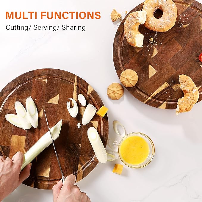 End Grain Butcher Block Round 12 IN, Premium Acacia Wood Cutting Board with Juice Groove, TJ POP Medium Chopping Board for Kitchen, 1 IN Thick