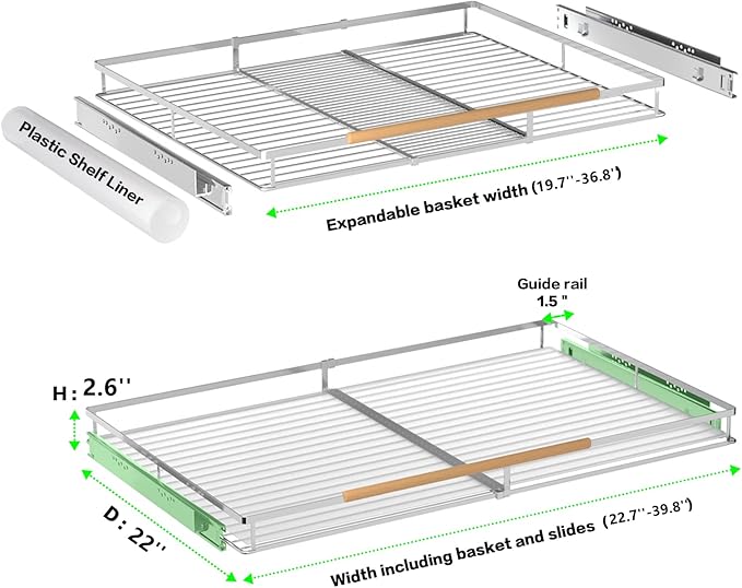 - Set of 2 pull-out cabinet shelves. The large basket can expand from 22.7 to 39.8 inch, Depth 22 inch, Height 2.6 inch. The width of the cabinet pull out shelves can be adjusted, so you can reasonably adjust the width of the sliding shelf according to the width of your cabinet.
