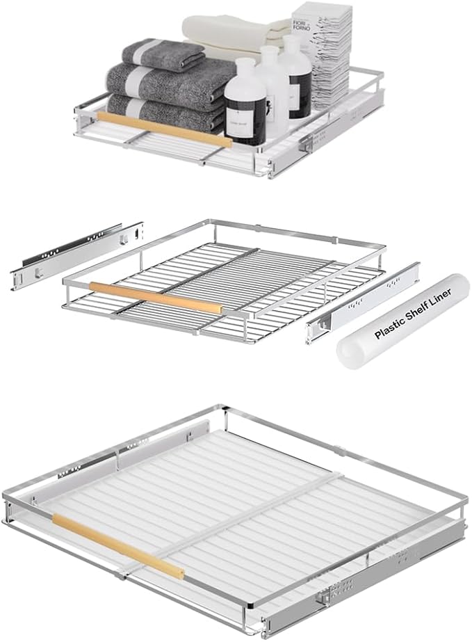 - Our pull-out cabinet organizer uses high-quality chrome plating, which can prevent scratches, is not easy to rust and deform, and is durable. And has a strong load-bearing capacity. The drawer shelves is removable and washable, give you a tidy home. Includes a 2-year limited warranty.