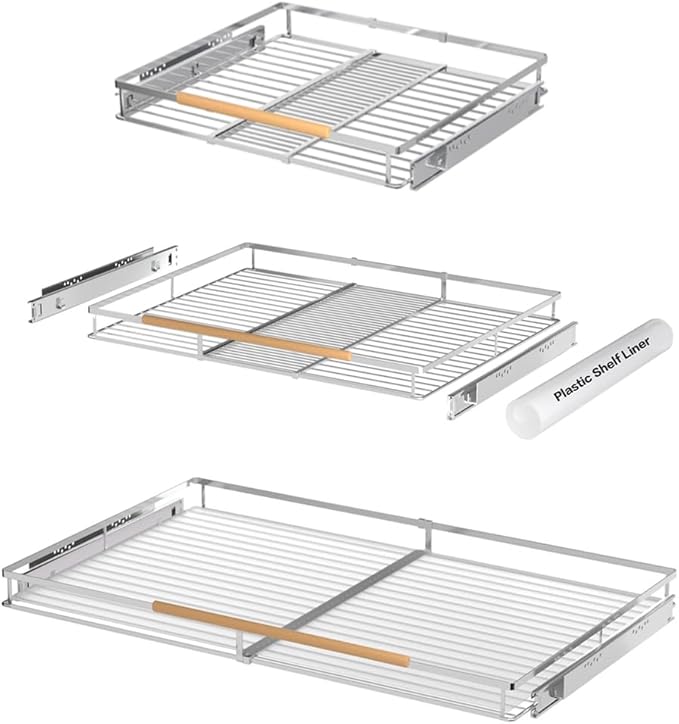 - Simple design can be matched with various styles of cabinets, kitchens and pantries, storing pots and pans, spice racks, jars, or other kitchen supplies. It can even be used as wardrobe dividers to tidy up the messy wardrobes. The drawer shelves is removable and washable, give you a tidy home.