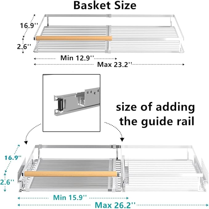 - 【Easy Installation】The pull-out cabinet organizer with a size of 15.9''-26.2''W x 16.9''D x 2.6"H. Package contains detailed instructions and all necessary hardware.