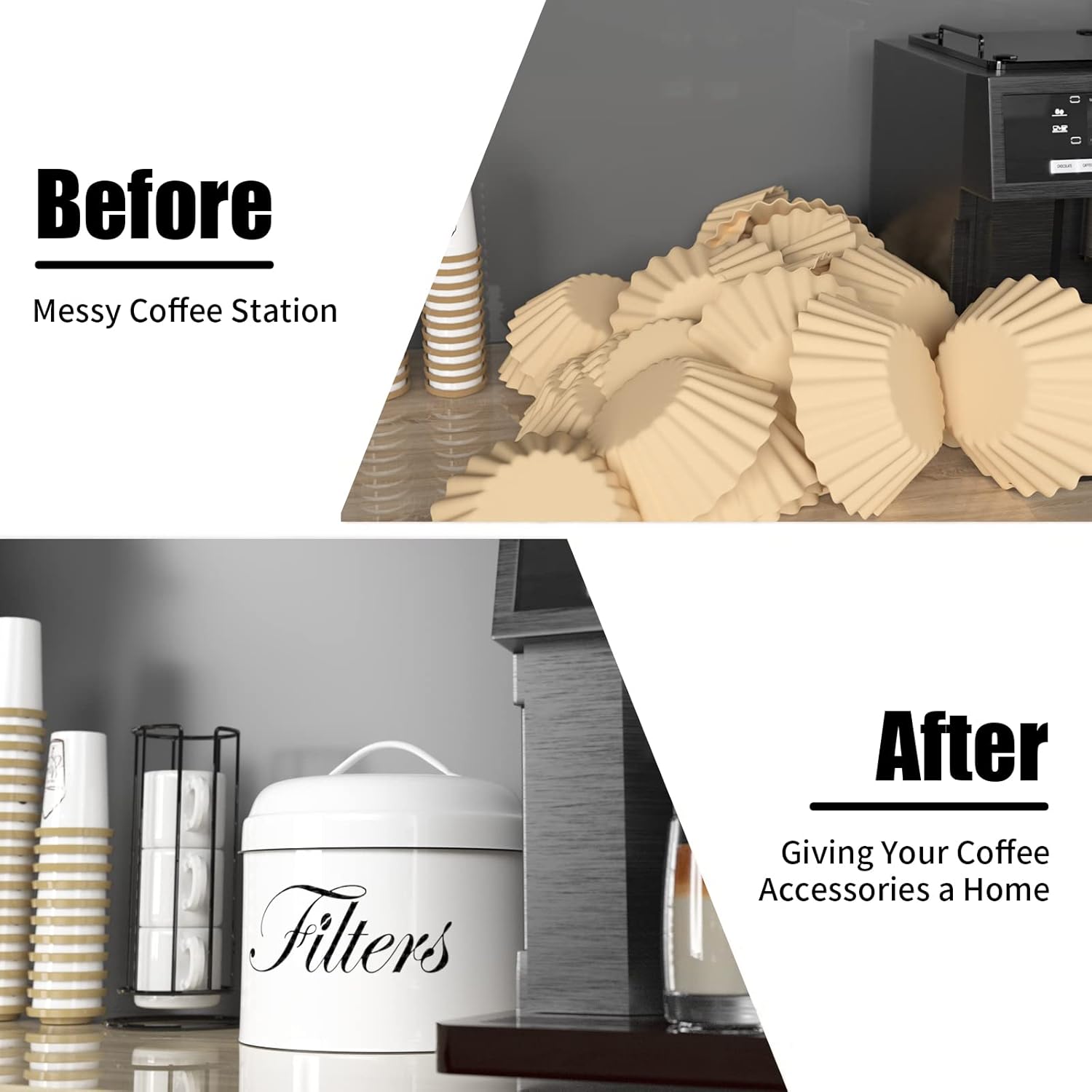 - STURDE & DURABLE COFFEE FILTER CONTAINER : Our coffee filter holder storage made of powder-coated galvanized steel, sturdy, not easy to break and deform, which can provide you a comfortable service for a long time. The smooth interior and surface are very easy to clean, just wipe with a damp cloth. Comes with a lid to keep the filter away from dust, moisture and other clutter