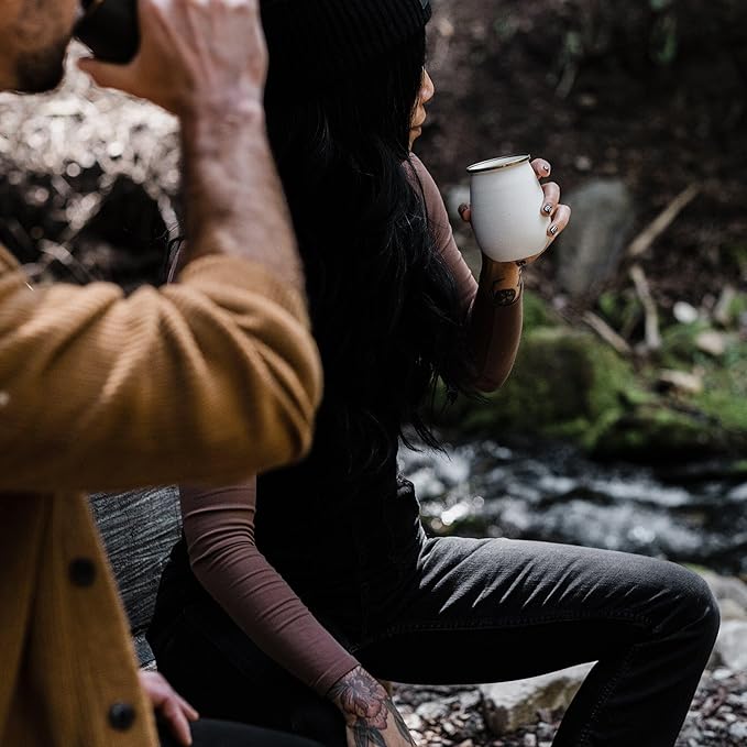 - UNIQUE AESTHETICS: Each tumbler showcases a hand-finished, baked stainless steel rim with a distinctive bronze-like patina, complemented by a speckled eggshell enamel finish for a vintage-inspired look