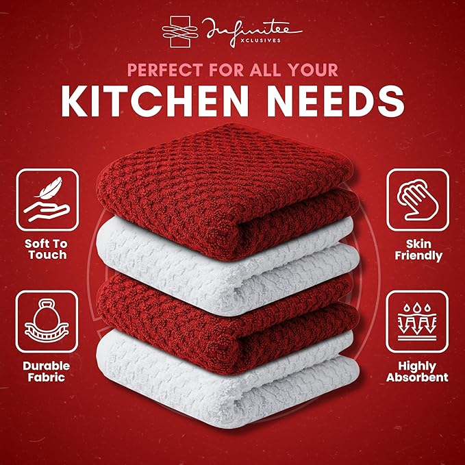 Infinitee Xclusives Premium Dish Cloth 100% Cotton 12 x 12 Inches |Pack of 4| - Ultra Soft Tea Towels - Highly Absorbent Kitchen Rags - Terry Dishcloth for Kitchen and Household Cleaning |Red|