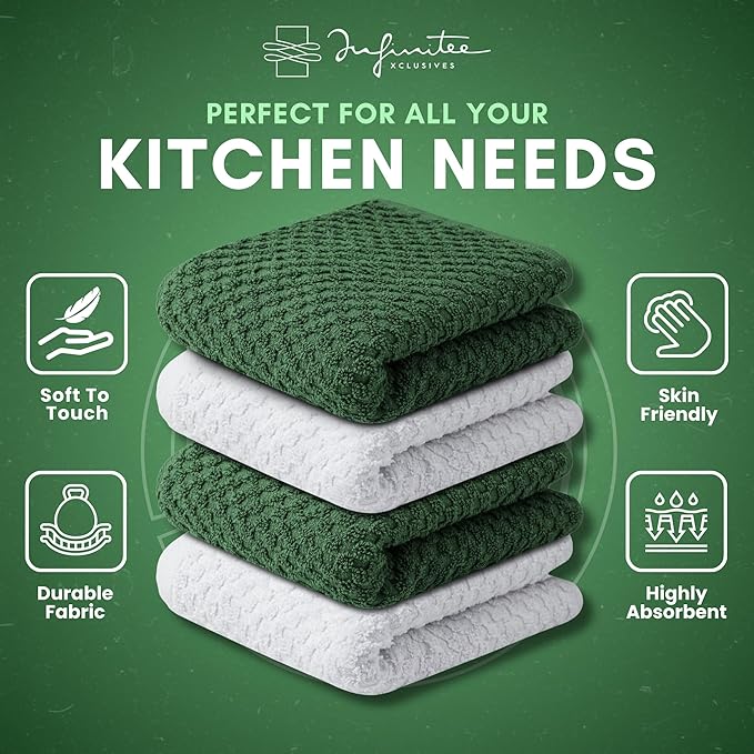 Infinitee Xclusives Premium Dish Cloth 100% Cotton 12 x 12 Inches |Pack of 4|-Ultra Soft Tea Towels-Highly Absorbent Kitchen Rags-Terry Dishcloth for Kitchen and Household Cleaning |Sturdy Green|