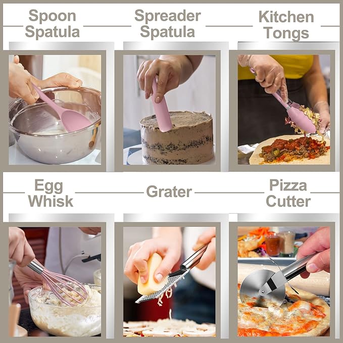 - 43 Pcs Kitchen Utensils Set & 43 Independent Functions: A set of 43 kitchen utensils can meet any cooking needs, we have carefully considered most of the scenes needed for kitchen use. Carefully selected such as: Slotted turner, Solid Spoon, Soup Ladle, Pasta Serve, Whisk, Brush, Kitchen Tong, Pizza Cutter, Grater, Measuring Spoons, Measuring Cups, etc. If you have any questions about this package, please feel free to contact our customer service and we are always at your service
