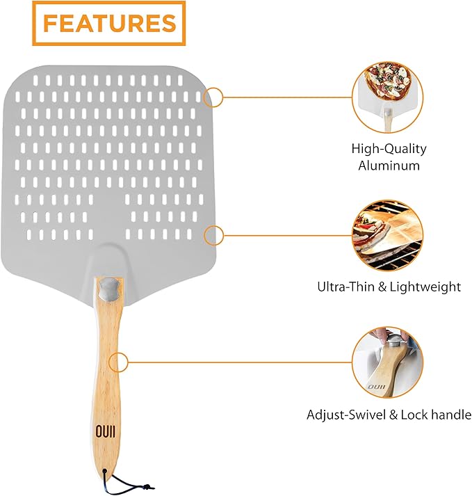 - ⭐ Adjust & Lock: Aside from the slender thickness and lightweight aluminum that allows you to move pizza pies with feather-light ease, the other great thing about the OUII Metal Pizza Peel is the Adjust-Swivel & Lock Handle! It compacts down for storage, extends to a full 26” length to protect against burns or deep pizza ovens, and it rotates for easy access around the pie, or in small spaces.