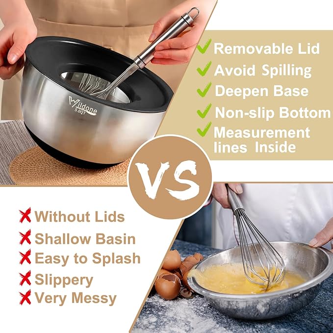 - Easy To Measure & Non-slip: Quarts and liters are engraved inside the bowls and fade proof, meet the demand of different measurement. The non-slip silicone bottom keeps the stainless bowls steady on counter tops when beating and whisking. You can mix, beat, or whisk ingredients with little mess as the wide, deep bowls have high walls to prevent splatter