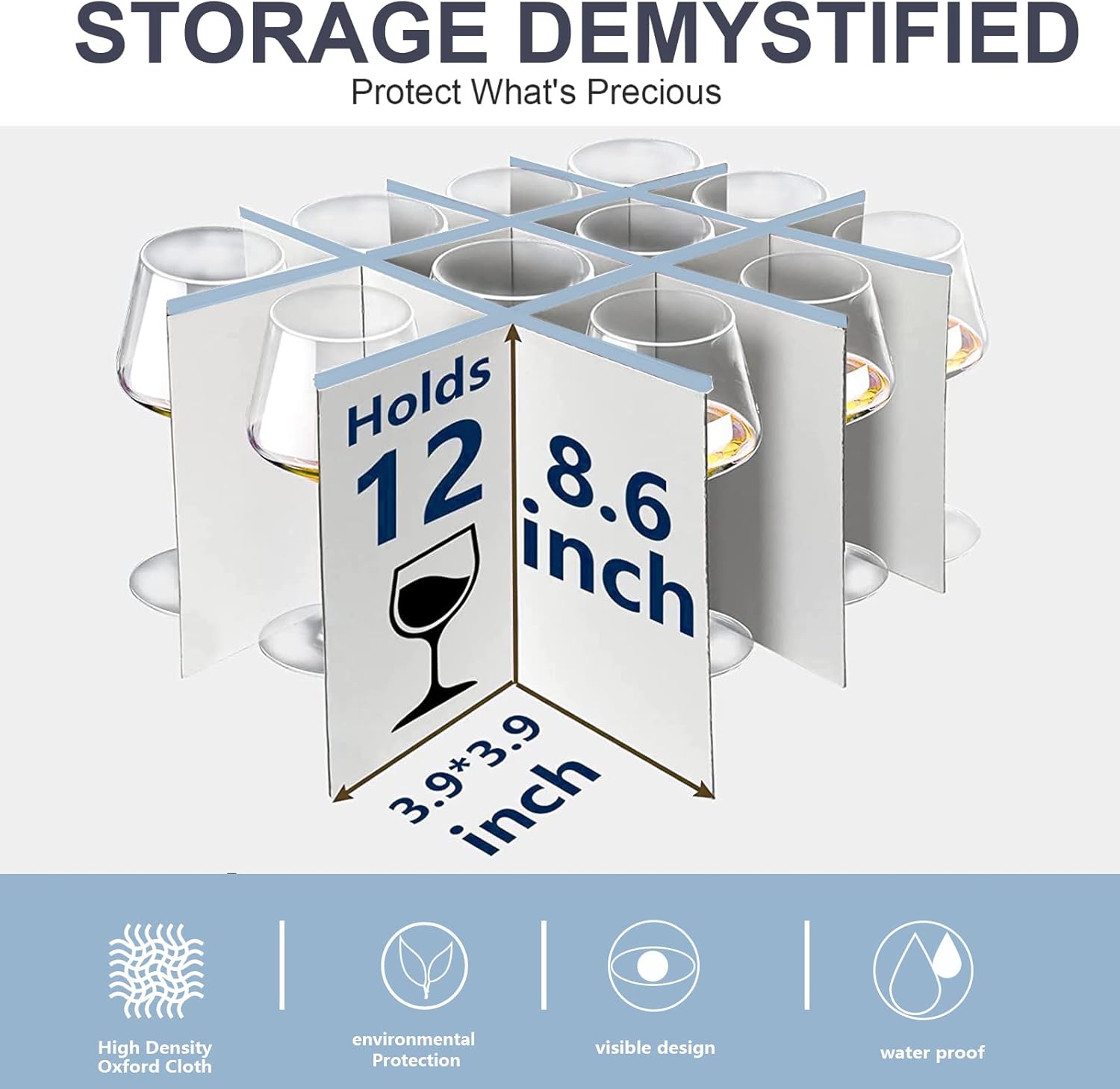 - 👍【Quality Material】: Both the stemware and mug storage bins with 2 sturdy handles.They are hard shell constructed by thick hard cardboard covered with quilted oxford cloth, each with 12 compartments to keep your glasses/cups from bumping into each other. For 4 dish storage containers, we provide 12 free felt separators, in total 48 sheets for you to put between plates to prevent scratches. Please rest assured that they will provide the best protection for your fine/delicate and fragile dishes.