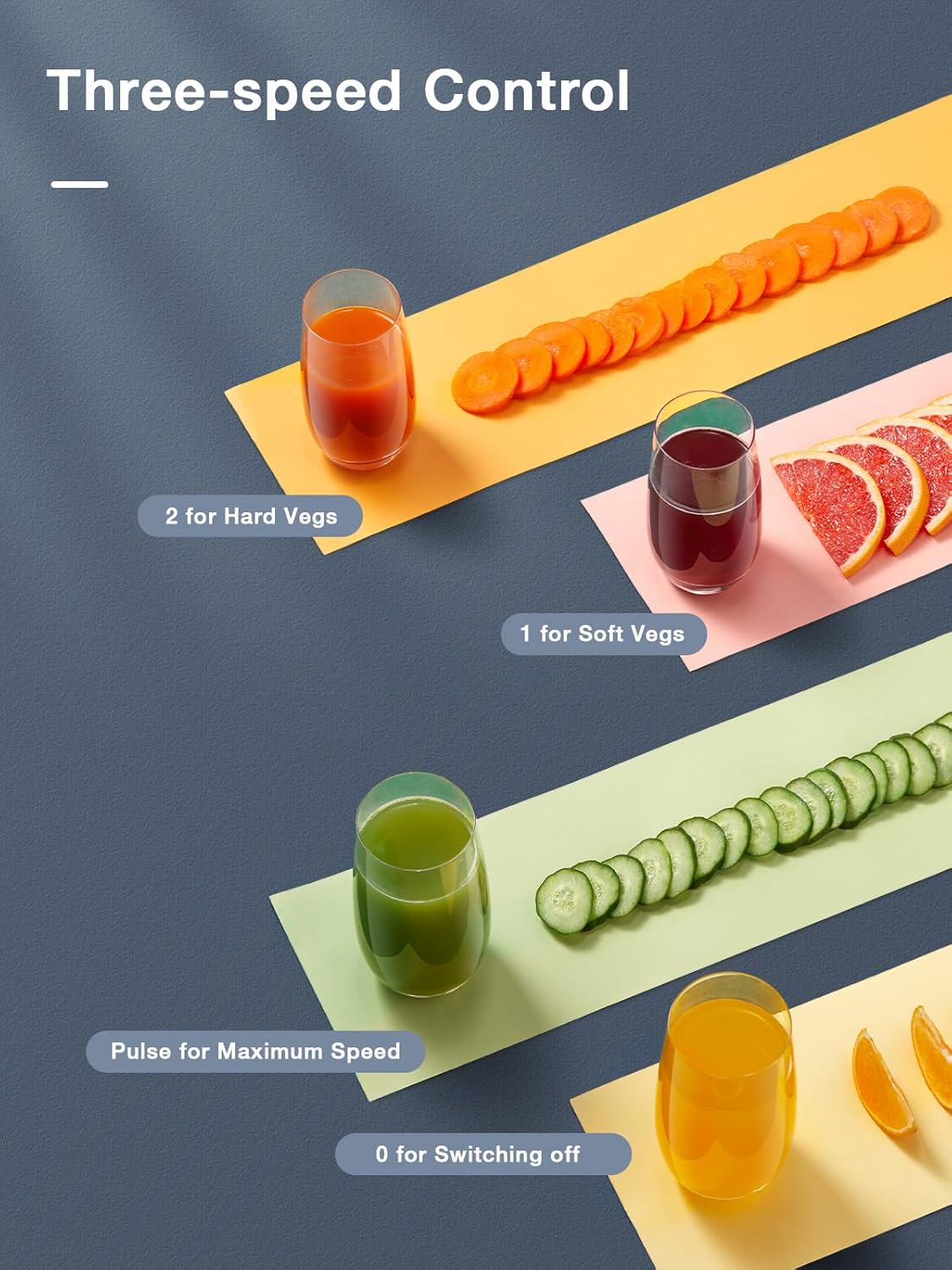 - 3-Speed Functions - "1" is a low speed, for soft fruits vegetables like oranges, watermelon, tomato, etc; "2" is a high speed, for hard food like apple, carrot, celery, etc. โPโ is the highest speed(Reach maximum speed after release). Customize your favorite juices, it makes the kitchen more colorful, you could juice a bunch of fresh juice and drink them to replenish energy and nutrition when needed