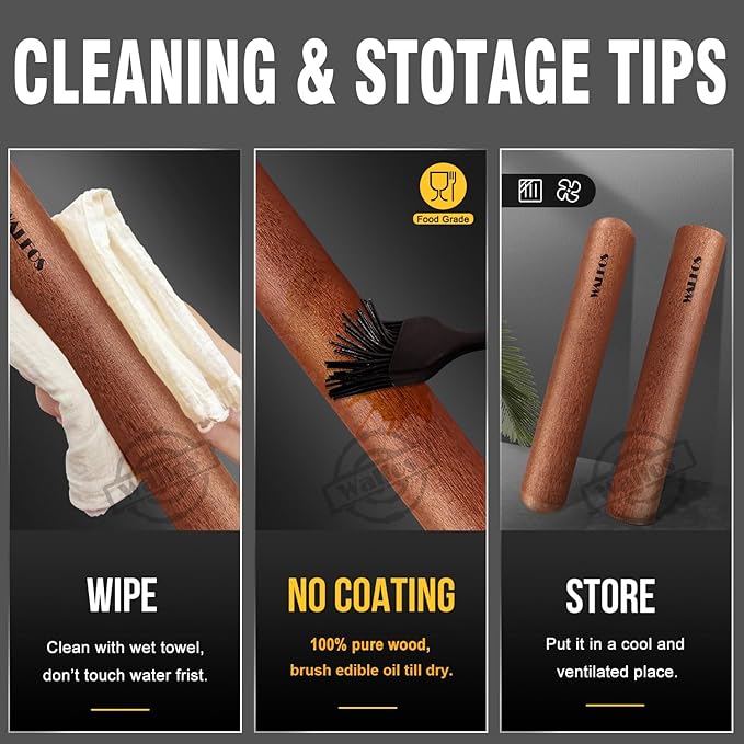 - 【EASY CLEANING & STORING】 - Natural non-stick wood pizza rolling pin set, you just need a towel to wipe it and brush edible oil till dry, store it in a cool and ventilated place. Note: Do not place in dishwasher or soak in water.