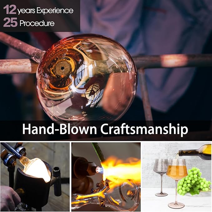 - 【Expert Craftsmanship】-Each colorful wine glass comes from exquisite craftsmanship and the pursuit of detail by artisans with more than 12 years of hand-blown experience.Carefully laser cut process delivers thin and tidy rim (lip-less) on the wine glasses,enhancing the taste of your wine with every sip.