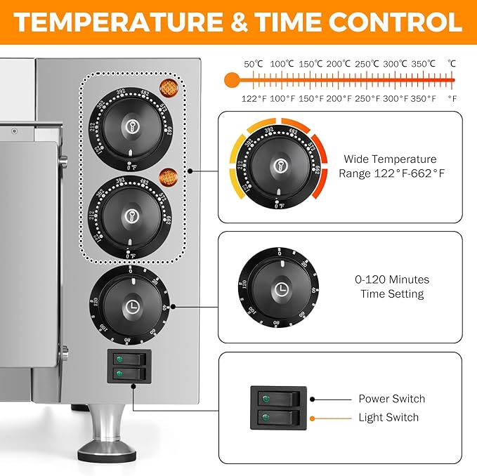 - DURABLE CONSTRUCTION: Commercial pizza oven a durable stainless steel exterior, combined with an aluminized steel interior for each cavity, easy to clean. Additionally,All six sides of the main shell and door are equipped with high-temperature insulation cotton, but prolonged use and excessively high temperature settings can cause an increase in external temperature. Please do not touch the pizza machine with your hands while in use to prevent burns