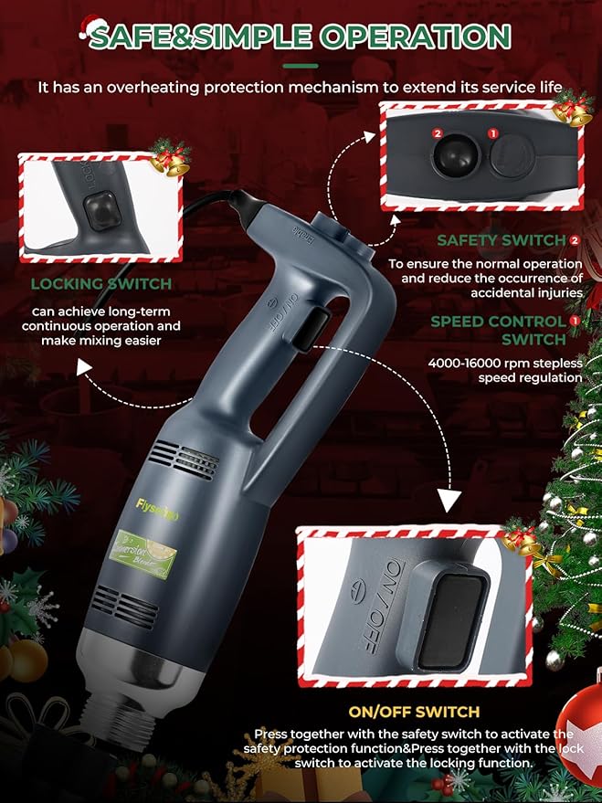 - Safe and simple Operation: 1. Equipped with a safety switch to ensure that the hand immersion blender works properly while reducing accidental injuries. 2. With a locking switch for long time continuous operation and easier mixing. 3. With overheating protection mechanism to prolong service life. And it is recommended that the single use time should preferably not exceed 20 minutes to ensure that the machine is more durable
