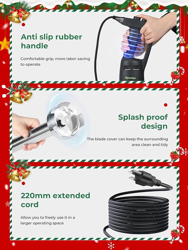- Thoughtful Design: Ergonomic design of the machine body creates more comfortable to use. Anti slip rubber handle, easier to grip, more labor-saving to operate, and reduces fatigue during the working process. The whole machine is well-made, sturdy and durable, and the splash-proof design of the blade cover can keep the surrounding area clean and tidy. 220mm extended cord allows you to use it freely in a larger operating space