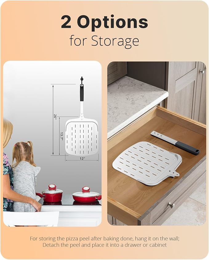 - Compact Storage, Easy to Clean: Allow you to hang the pizza peel on the wall or detached the pizza peel to place them into kitchen cabinet. The aluminum blade that does not absorb food particles or unwanted odors and will not give you a hard time cleaning this peel.