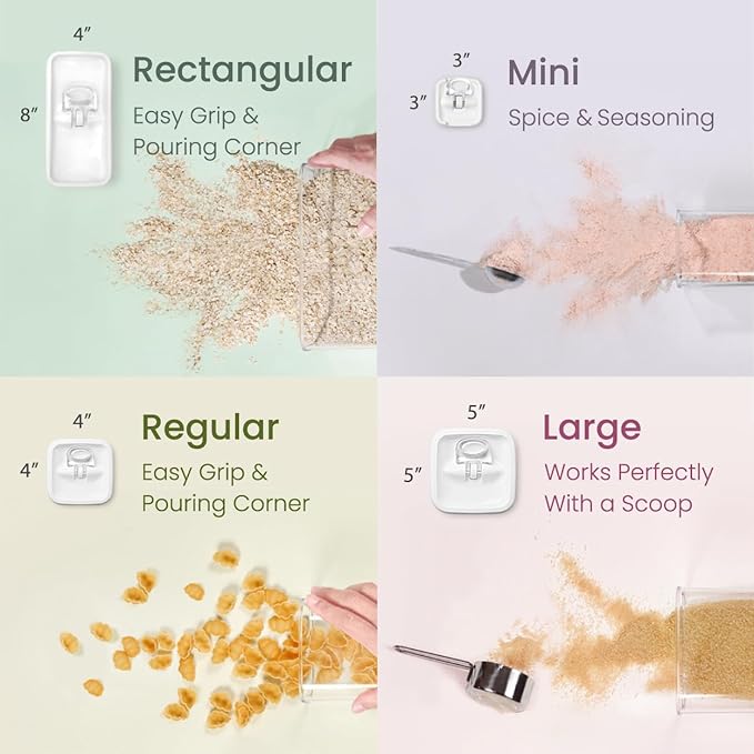 - VERSATILE SIZES & SHAPES FOR EVERY STORAGE NEED: The Flip Tite container collection offers a variety of sizes and shapes to accommodate different food storage needs: 4” REGULAR & 4” x 8” RECTANGULAR - Ideal for small kitchen counters and pantries, easy to handle and pour. 5” LARGE - Perfect for storing sugar, beans, and other scoopable ingredients. 6” XL - Designed for bulk storage of items like rice, flour, and powdered ingredients, compatible with measuring spoons.