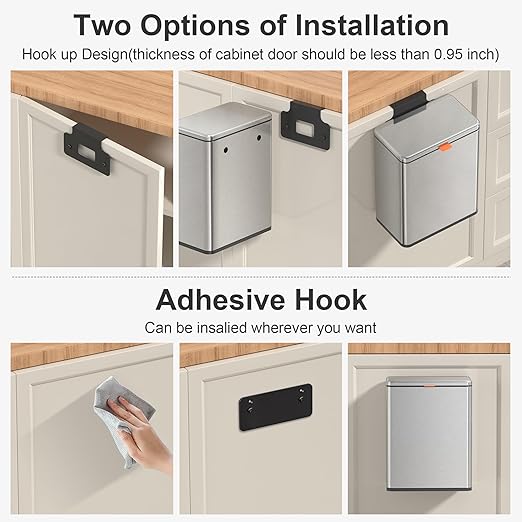 - 【WALL MOUNTED/COUNTERTOP/ UNDER SINK TRASH CAN】: No need to bend over. The trash can provide Two opening and installation methods,Effortless and Fits for Most Cabinet Doors, Pantry Doors. The thickness of door should be less than 0.98" (2.5cm). Small trash can can also be glued on kitchen or bathroom wall or under the sink.
