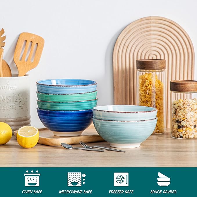 vancasso Bonita 27 Oz Cereal Bowls Set of 6, Blue Ceramic Bowls for Kitchen, 6 Inch Soup Bowls, Dishwasher & Microwave Safe