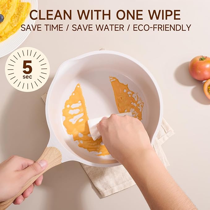 - Thoughtful Safety Features: Easy-to-grip handles stay cool, ensuring safe, hassle-free use. Dual pour spouts enable drip-free draining, while the balanced weight ensures steady control when flipping pancakes or stir-frying