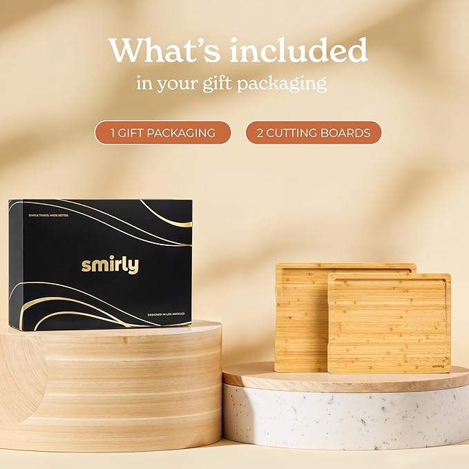 SMIRLY Bamboo Wooden Cutting Boards for Kitchen, Set of 2 Medium - Small, Bamboo Wood Cutting Board Set with Deep Juice Grooves, Non Toxic Serving Tray, House Warming Gifts