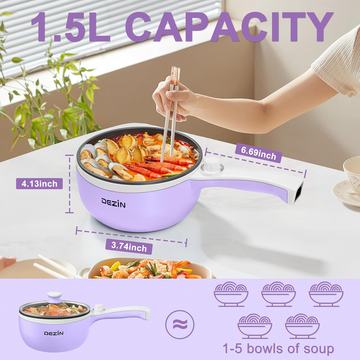 Dezin Hot Pot Electric with Steamer Upgraded, Non-Stick Sauté Pan, Rapid Noodles Electric Pot, 1.5L Mini Pot for Steak, Egg, Fried Rice, Ramen, Oatmeal, Soup with Power Adjustment