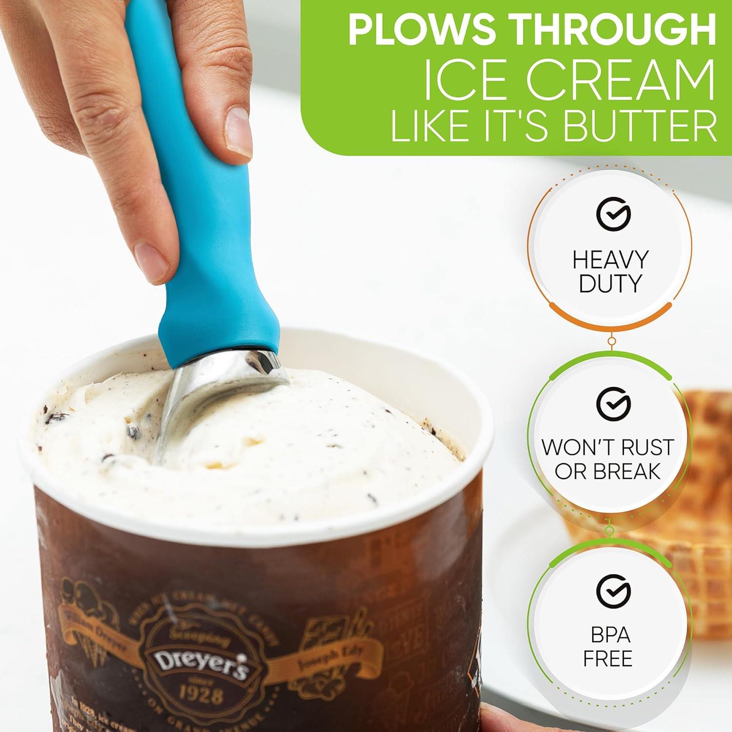 - Plows Through Ice Cream Like It's Butter - Glides smoothly and easily through hard-packed frozen sweets. It will seem like ice cream flows right into the scoop and drops into your bowl or cone with little to no effort.