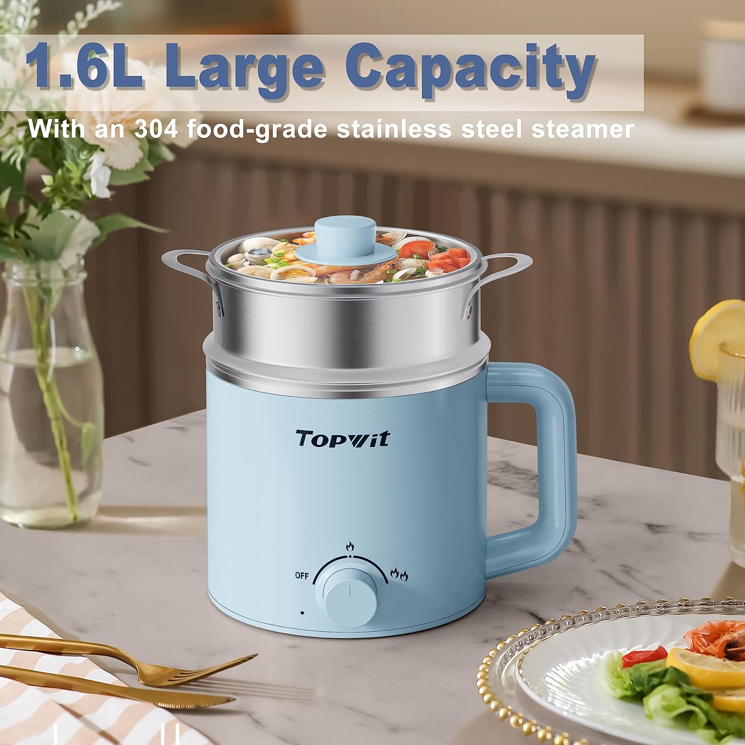 Topwit Hot Pot Electric with Steamer, 1.6L Ramen Cooker, Electric Pot for Pasta, Shabu-Shabu, Oatmeal, Soup and Egg, Portable Cooker with Dual Power Control, Dorm Room Essentials, Blue