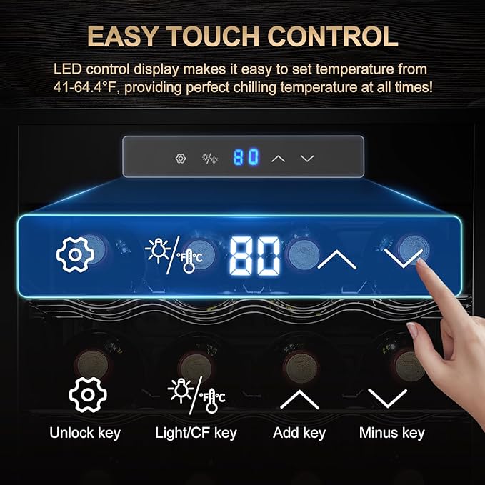 - 【Soft Interior Led Lighting】 - As a wine collector hobbyist knows the fact that the strength of different lights can greatly affect the quality and taste of the wine category. This BODEGACOOLER 24 Bottle mini fridge with lock uses a soft LED white light to illuminate, which not only allows you to easily monitor the temperature and internal condition of the Compressor Wine Cooler Refrigerator, but is also a favorite luminosity for wines and other liquors.