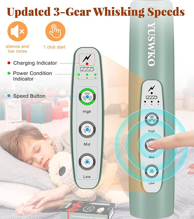- 🎀【3-Speed Settings】The coffee mixer has 3-speed buttons on the main body of the mini hand mixer, low, medium and full, allowing you to control and achieve the ideal milk frothing effect. Rich foam can be created in 30 seconds, allowing you to instantly enjoy the silky drink! Just rinse this frother handheld with running and clean water after use. Low, medium and high battery status indicators, the remaining power is clear at a glance, and schedule a charge anytime.