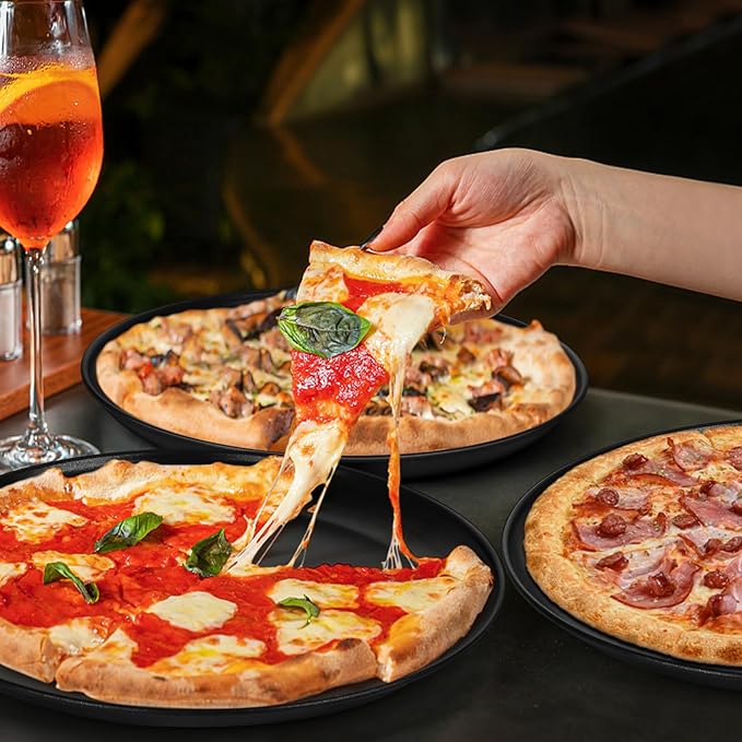 - 【13.5 Inch, Set of 3】Getting 3 pans in this set, Dia. 13.5 inch x Height 0.8 inch, Easy to make large pizzas and bake 3 different pizzas easily at the same time for party or birthday, It will meet your daily baking and cooking needs, Like baking pizza, chicken wings, beef and cookies, serving salad, snacks and fruits, and reheating leftovers