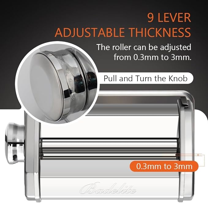 - ADJUSTABLE 9 THICKNESS ROLLER - The roller has a knob with 9 levels of adjustment. Gently pull out the knob and rotate it to set the dough thickness you want for the roller. The thickest is 2.5mm, the thinnest is 0.25mm, and the bigger the number, the thicker it is. When using, we recommend that the thickness of the roller gradually change from thick to thin. 150mm wide roller is very suitable for manual pasta making.