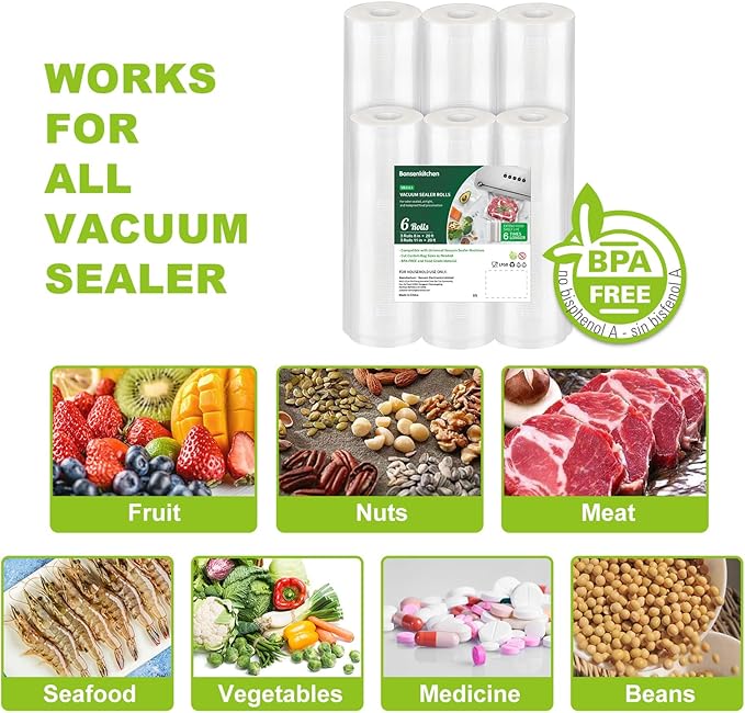 - CUSTOMISED-SIZE FOOD VACUUM BAGS: Bonsenkitchen vacuum sealer roll is compatible with all major brand vacuum sealers, you can make a customized-size vacuum bag in a few seconds.