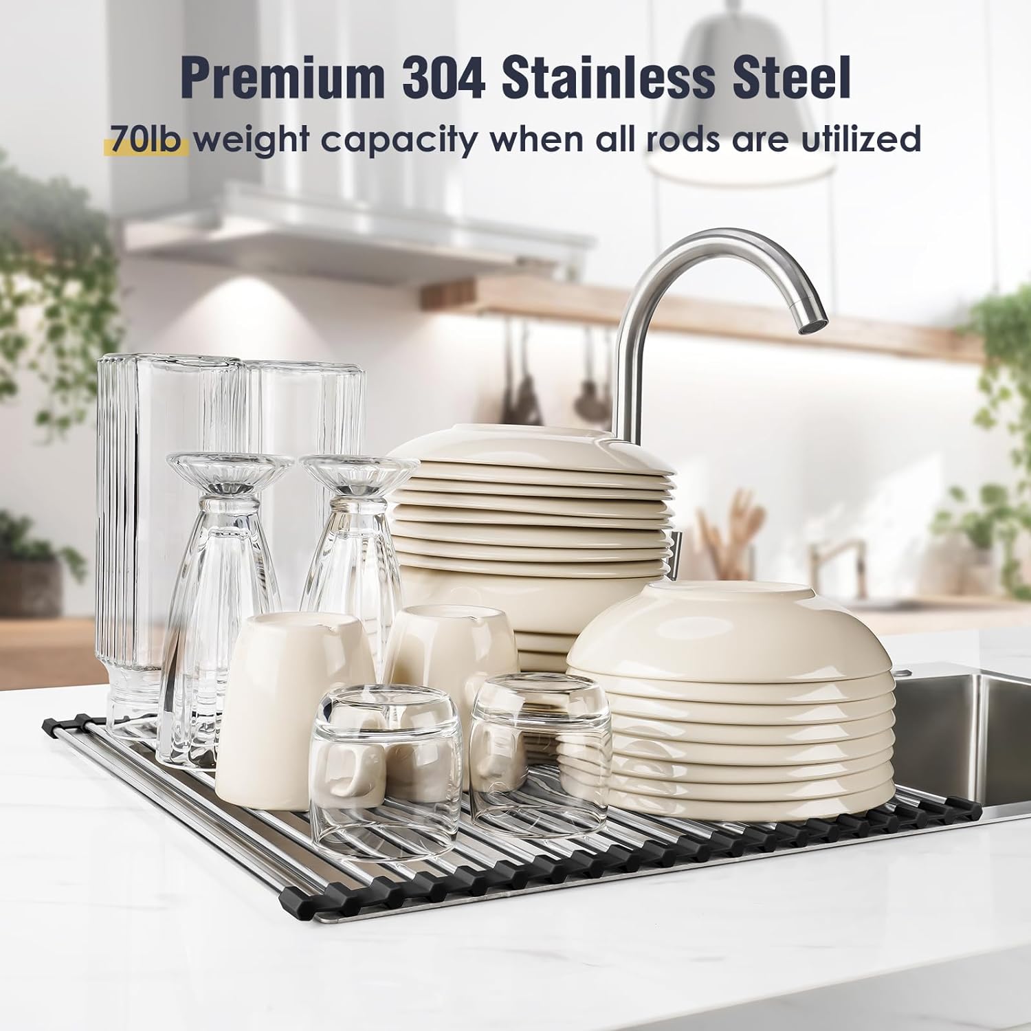 Tomorotec 21" x 15.5" Roll Up Dish Drying Rack Over Sink Drying Rack Sink Cover Kitchen Sink Accessories Gadget Multipurpose Organizer Foldable Stainless Steel Drainer