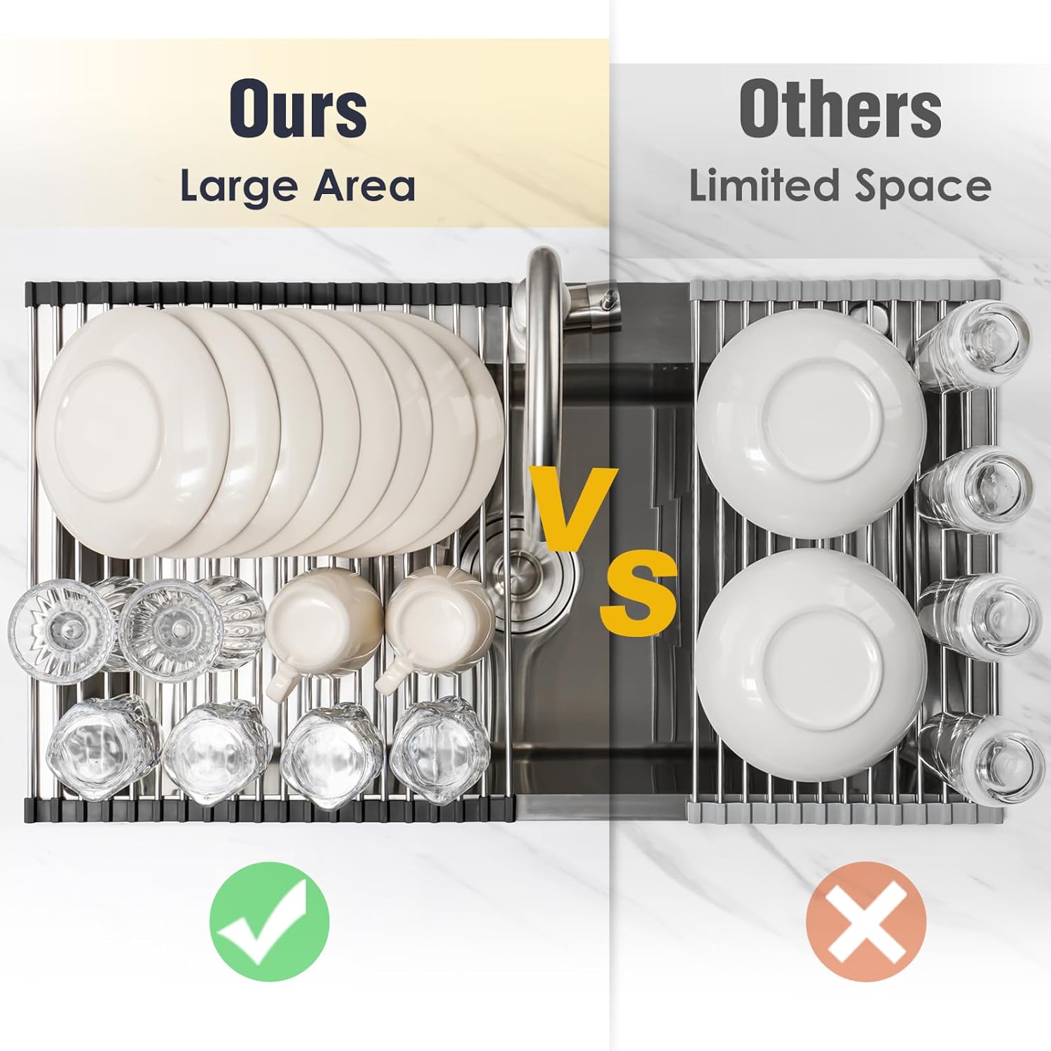 - [Multipurpose Drying Rack] - Perfect for air-drying kitchenware such as dishes, mugs, bowls, pans, glasses, cups, plates, cookware, cutlery, saucepans, bottles, and even fruits and vegetables. A must-have kitchen gadget.
