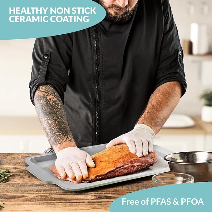 - DURABLE SHEET PAN: This baking sheet pan is made from premium carbon steel material with ceramic coating, guaranteeing long-lasting durability and heat resistance.The ideal nonstick oven pan for all your baking needs.