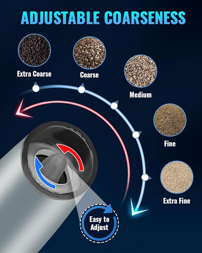 XinXu Gravity Electric Pepper Grinder, Salt or Pepper Mill & Adjustable Coarseness, Battery Powered with LED Light, One Hand Automatic Operation -Set/Light Grey