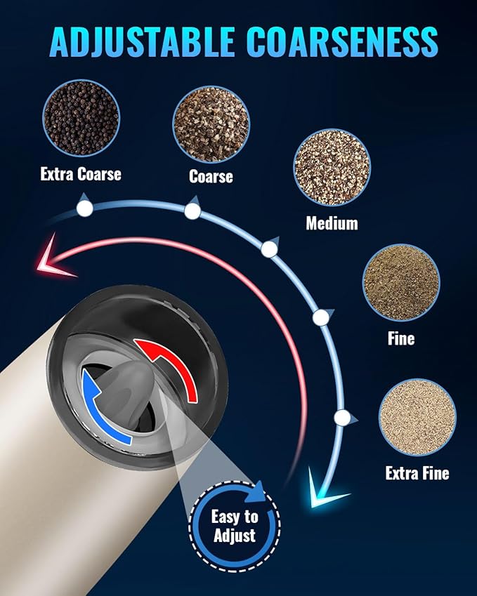 - 【Adjustable Grinder】 Many grinding levels for your choice allows you to grinder your spices from coarse to fine. Electric pepper grinder use a high-quality ceramic rotor. You can choose the coarseness of your spice, salt or pepper by turning adjustment knob at the head of the grinder.